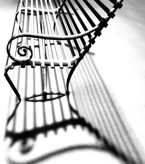 The image was captured when a streetlight casted long shadows through a park bench onto the pristine snow covered ground.