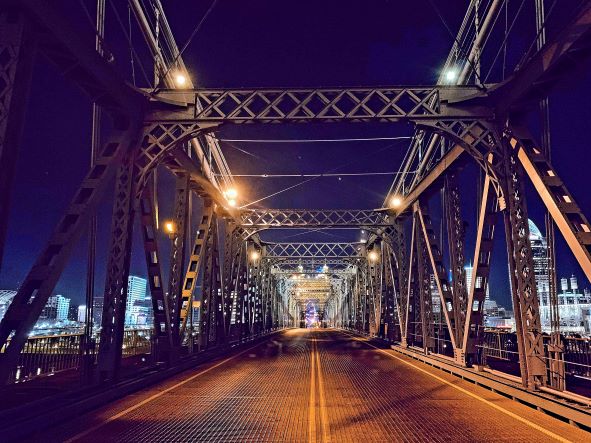 My favorite part of the image is the skyline and ferris wheel of Cincinnati slightly hidden by the structure of the bridge.